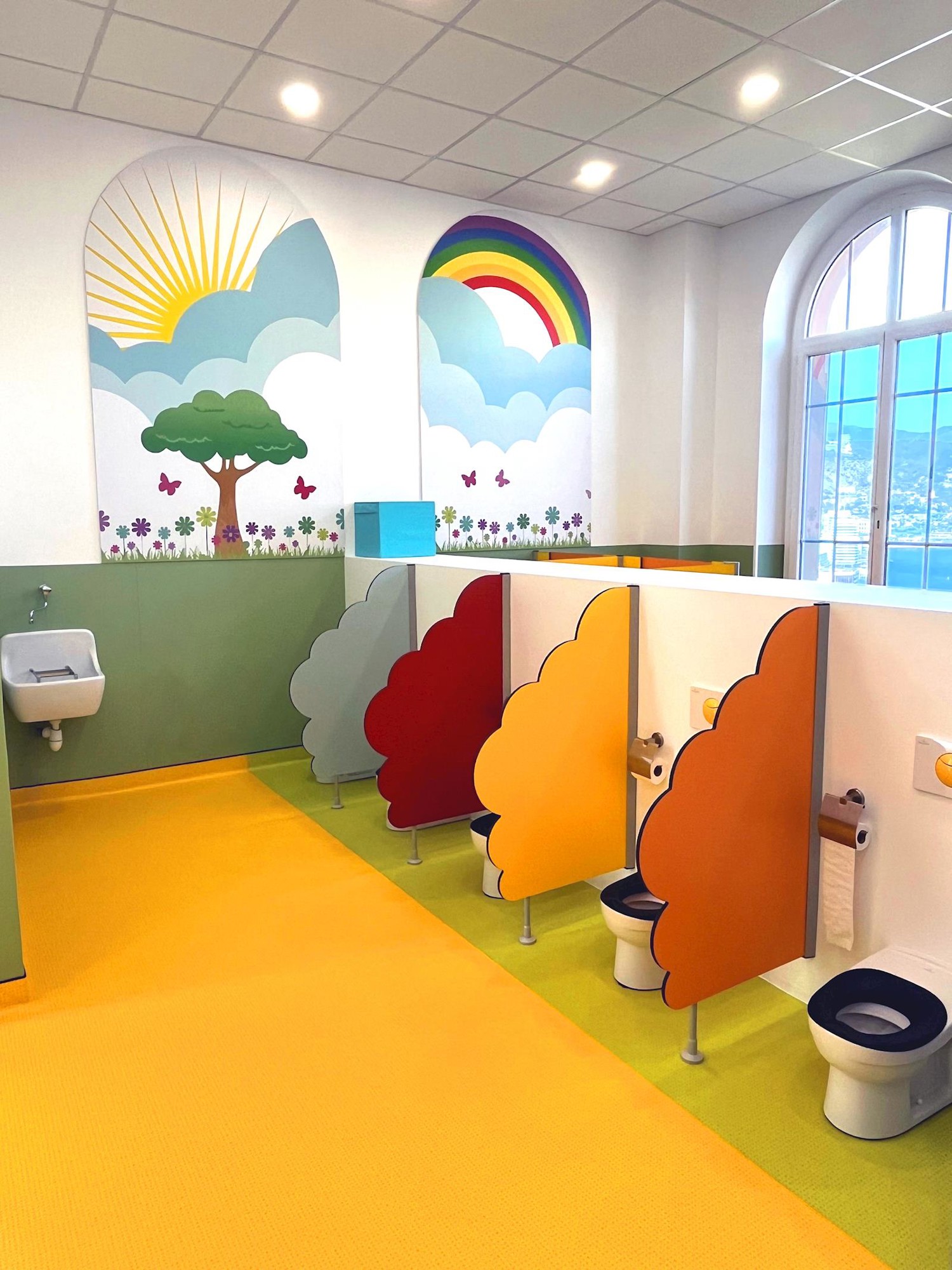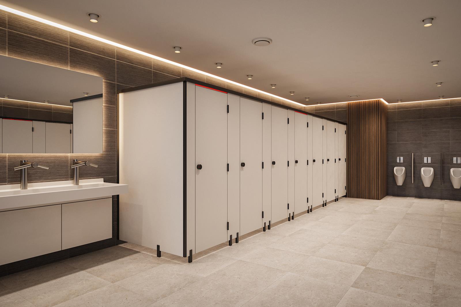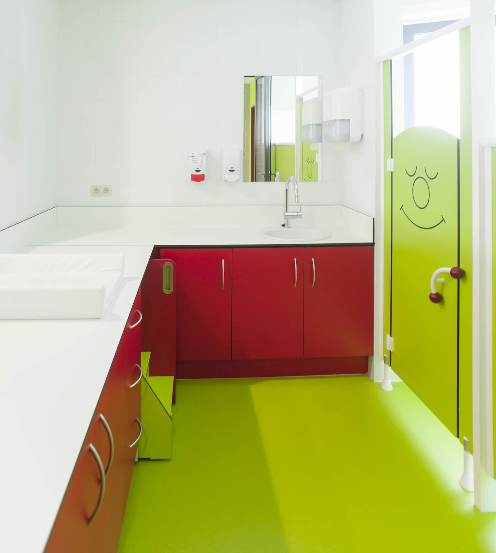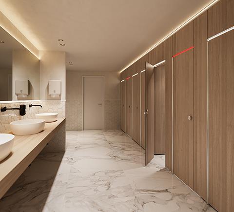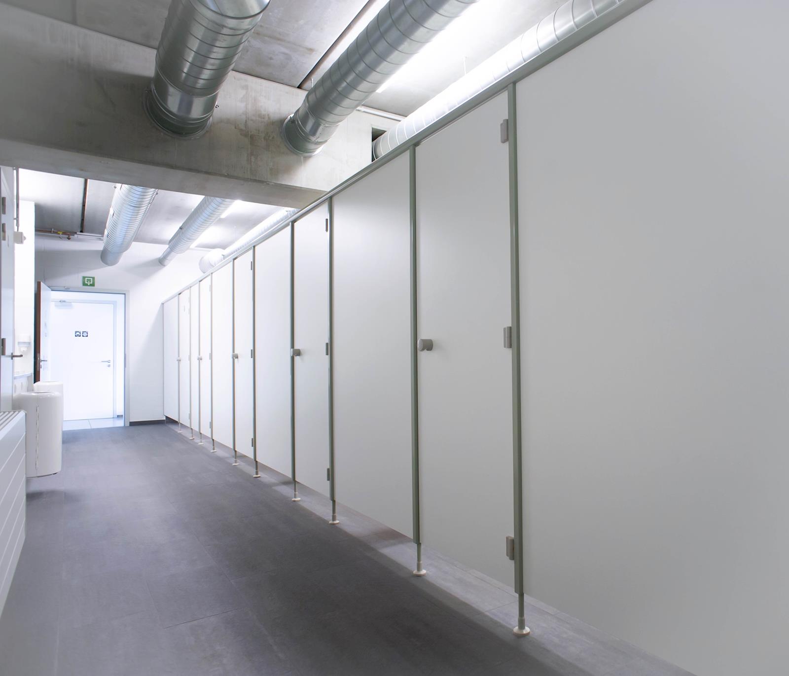 De wanden uit massieve kunststofplaten zijn zeer slijtvast, waterbestendig, antibacterieel en buitengewoon onderhoudsvriendelijk.