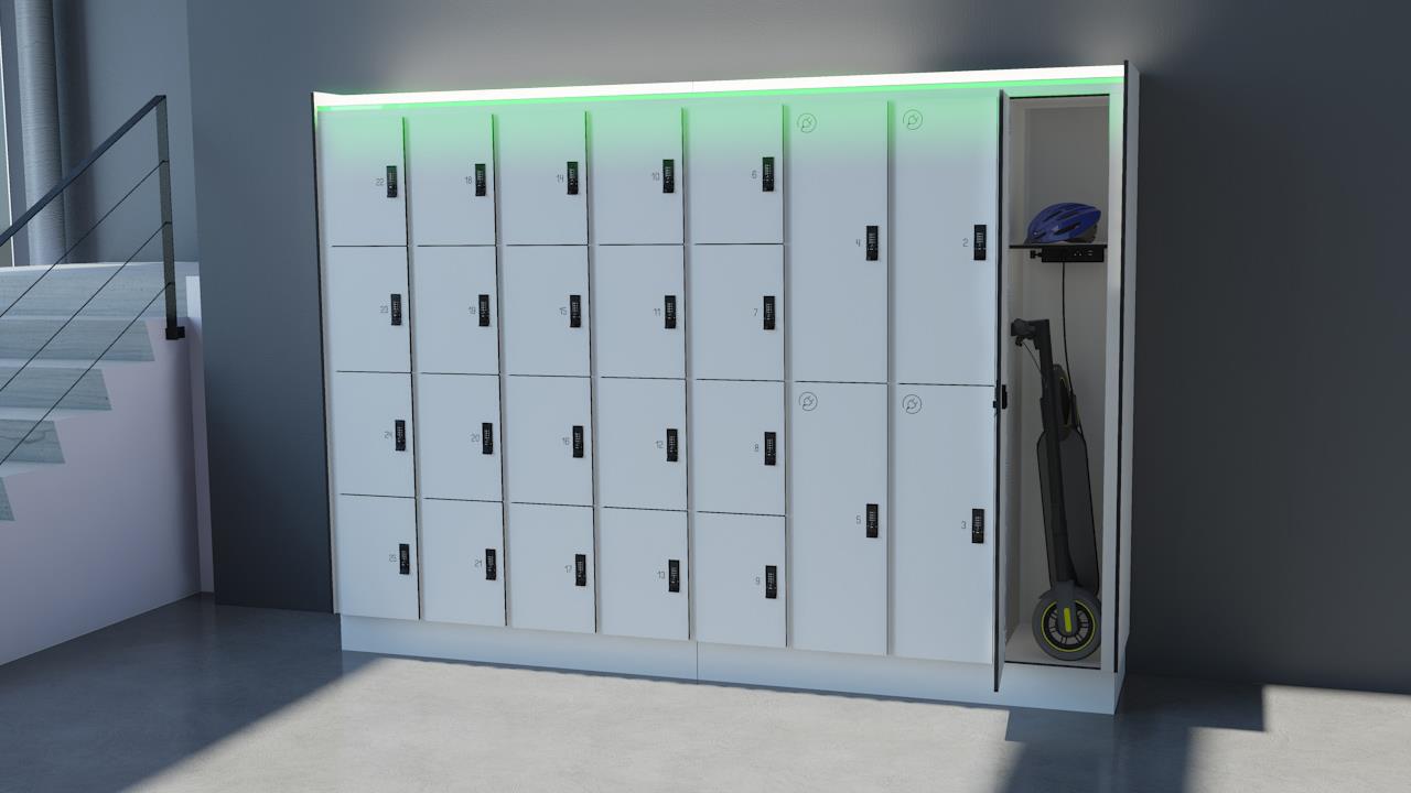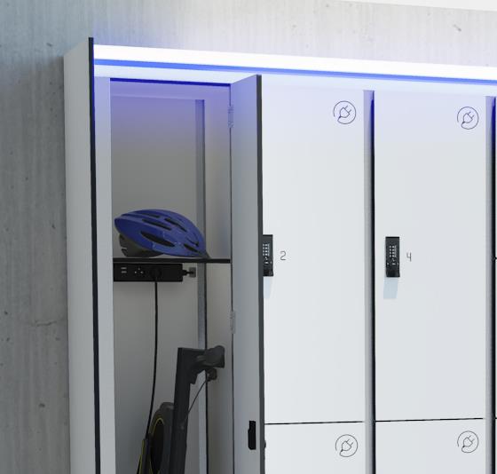 De AFKOR type K.smartline-e is een oplaad- vestiairekast specifiek voor het opladen van fietsbatterijen, steps, frigoboxen,... en het opbergen van fietskledij, -helm, -zak,...