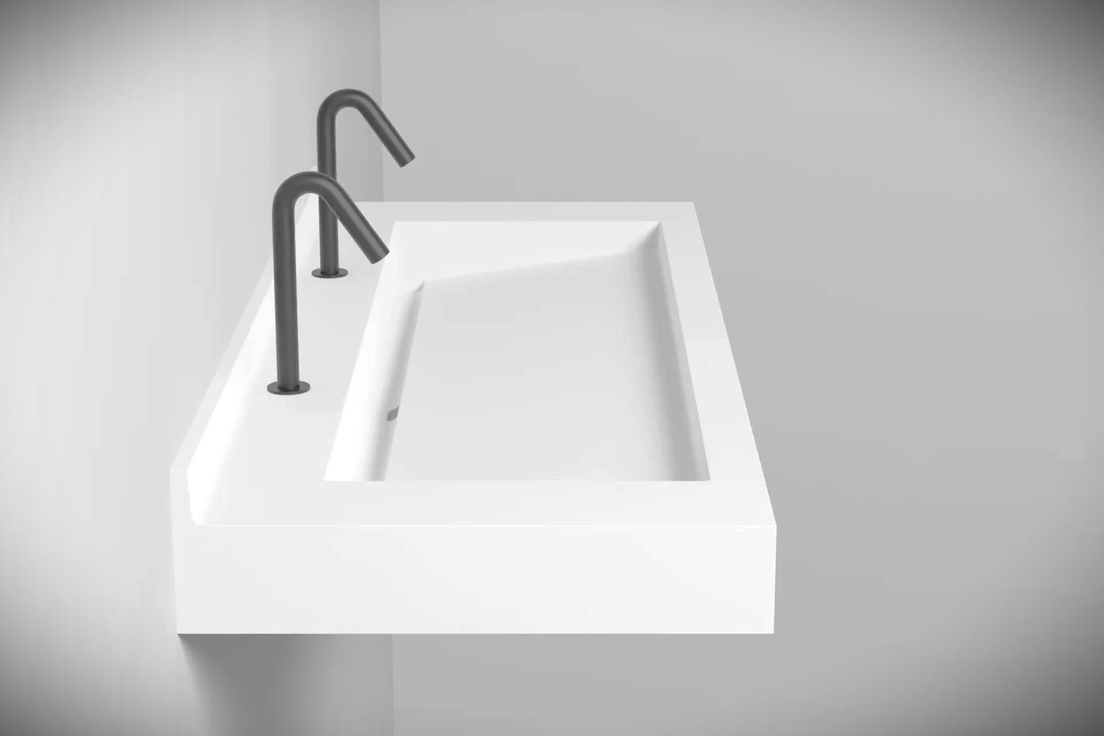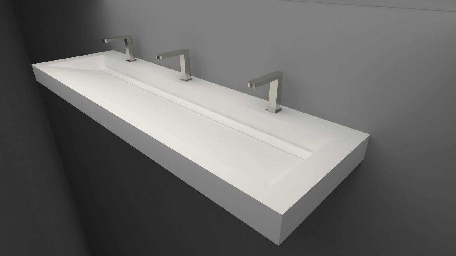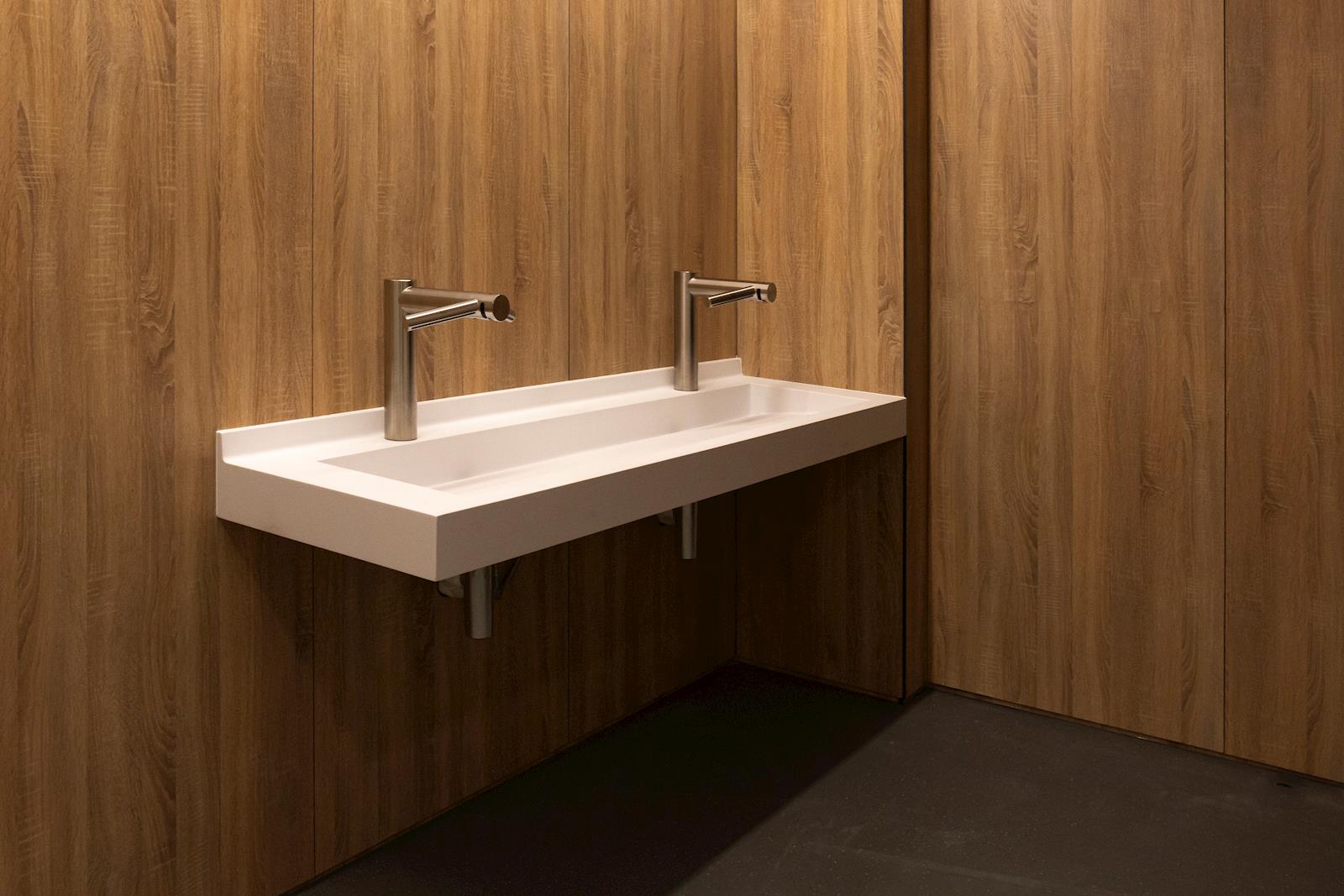 Bij de gemeenschappelijke wastafel wordt de ruimte geoptimaliseerd en het aantal gebruikers vergroot door de vaste ruimte tussen elke lavabo weg te nemen.