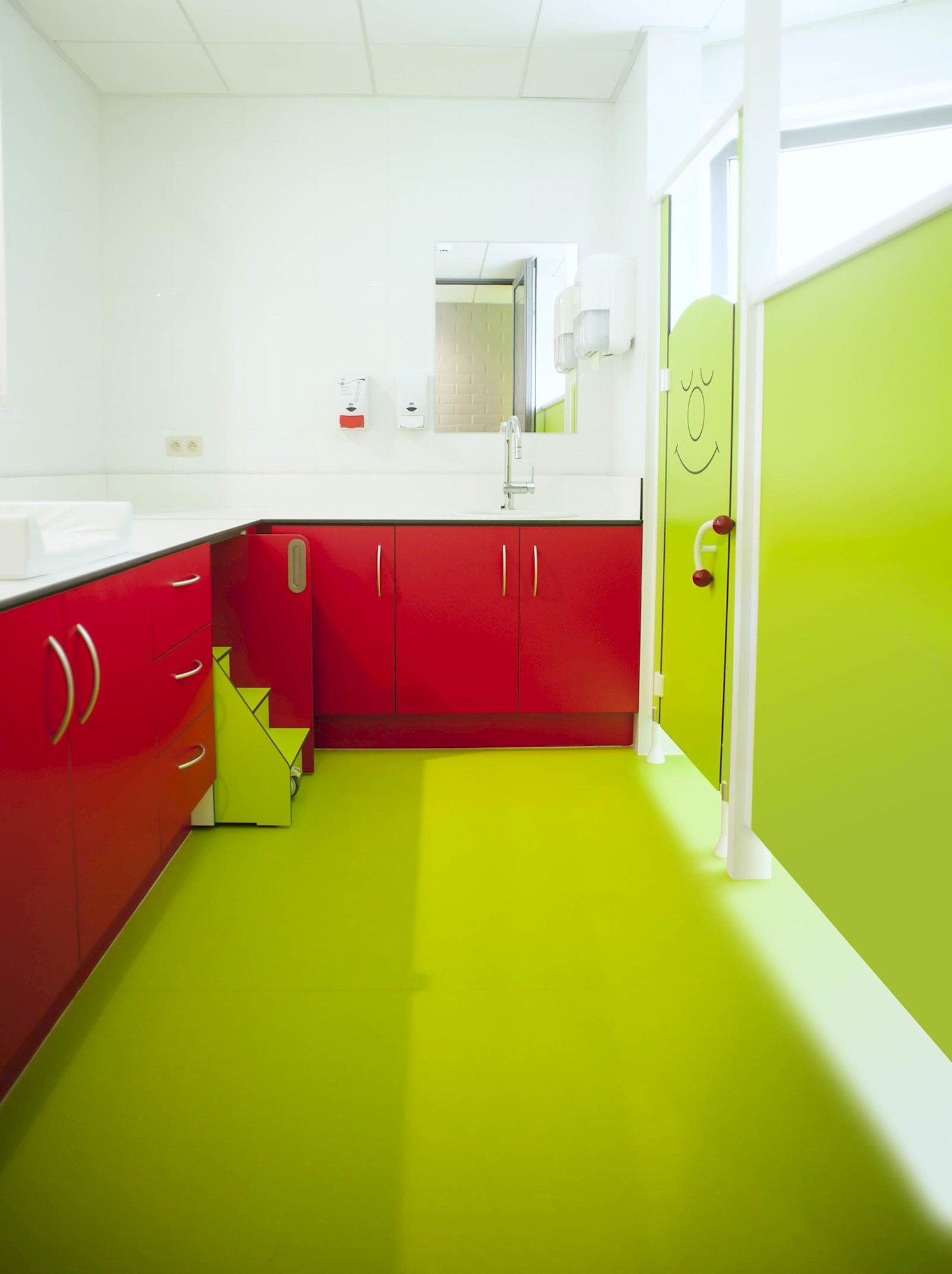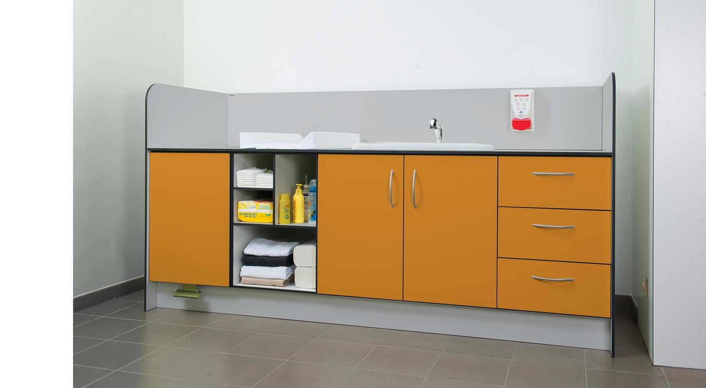 Dit functionele verzorgingsmeubel, gemaakt uit 13 mm HPL en bestaande uit verschillende modules tot een alles-in-éénmeubel, is uiterst gebruiksvriendelijk, veilig en ontworpen voor zeer intensief gebruik.